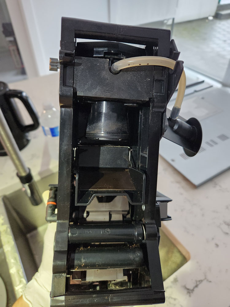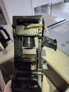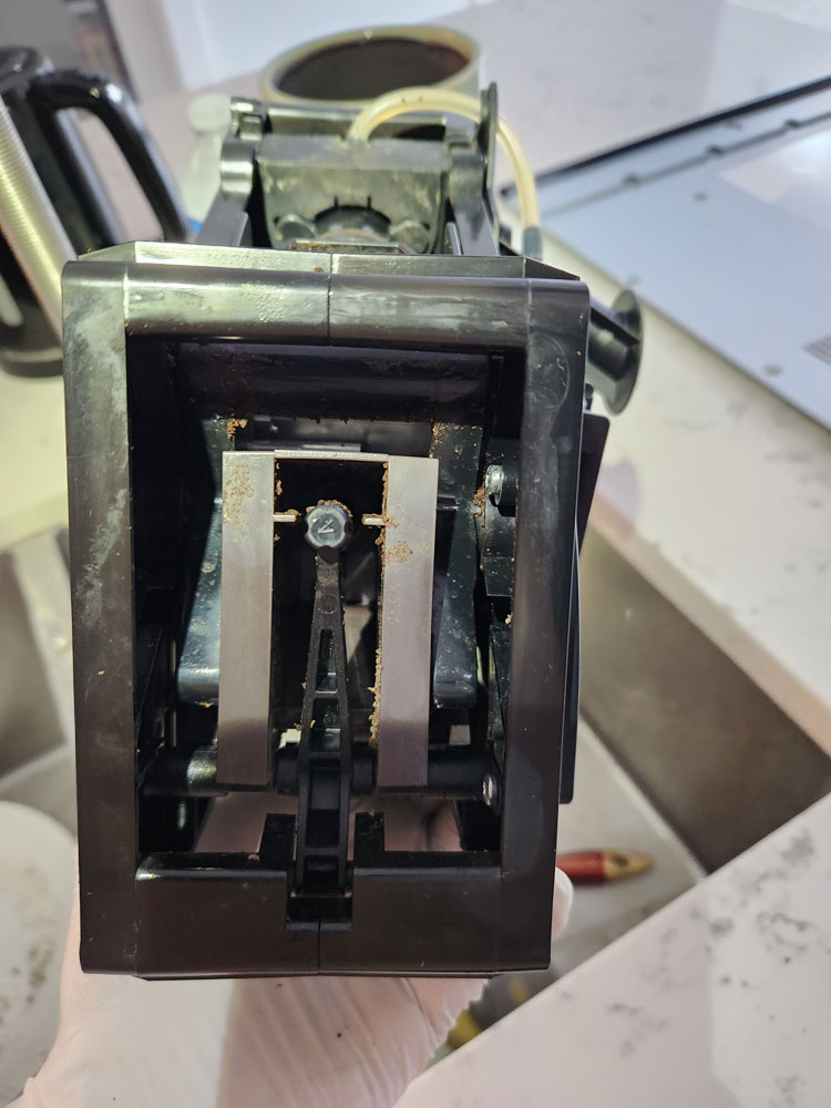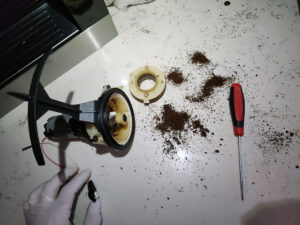 After a quick diagnostic (which we offer free with repair, by the way), our technician found the culprit: a clogged grinder packed with old, oily beans and the entire internal system covered in mold. This kind of buildup doesn’t just affect taste — it can damage the grinder motor and even ruin the machine permanently if left unchecked.